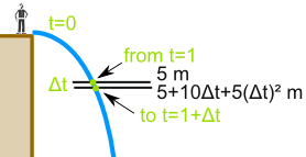 So the speed is 10 + 5Δt m/s, and Sam thinks about that Δt value ... he wants Δt to be so small it won't matter ... so he imagines it shrinking towards zero and he gets: